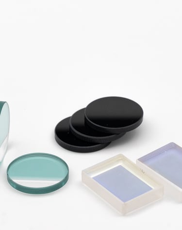 Singlets : Plano-vex, Plano-Cave, Bi-vex, Bicave, Meniscus; Doublet and Triplet lenses; Filter windows from RG, UG, KG, BG, and NG Schott glasses including 2 glass split windows